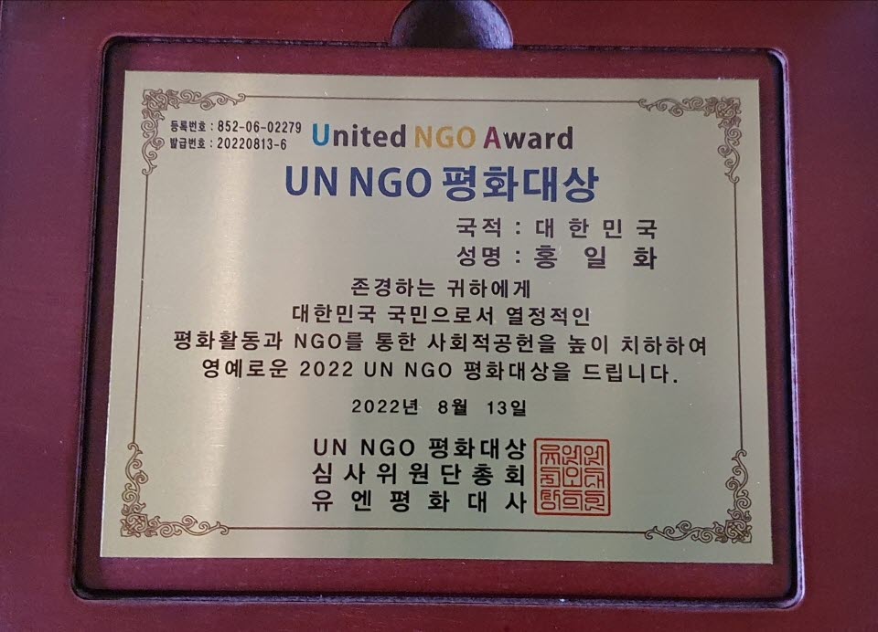 지난 13일 서초구 리버사이드 호텔에서 열린 시상식에서 홍 이사는 열정적인 평화활동과 사회적 공헌을 치하하는 2022 UN NGO 평화대상을 수상하는 영예를 안았다.